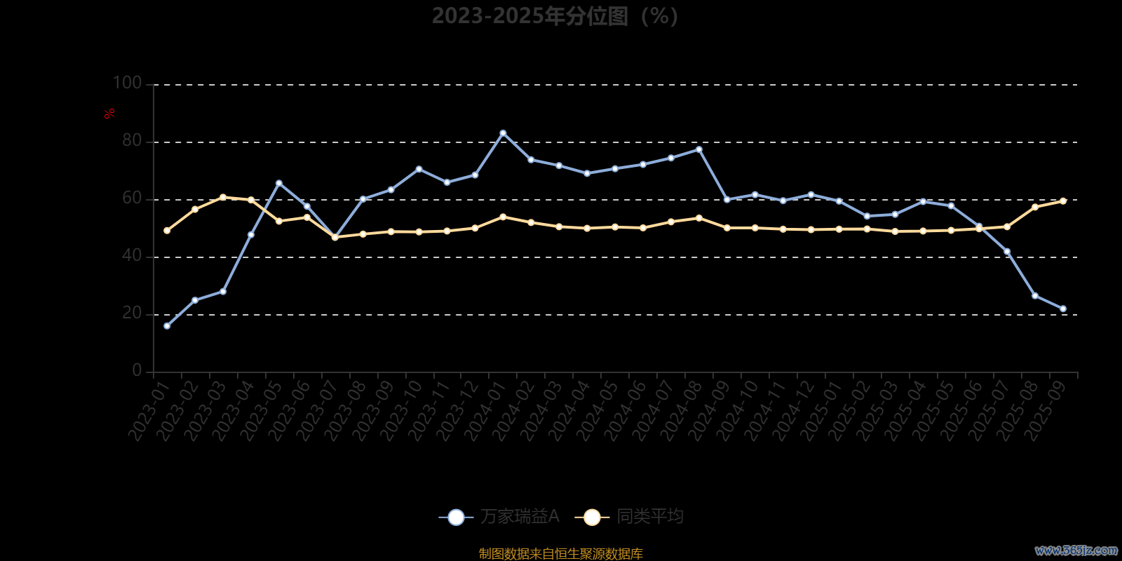 通过所选区间该基金净值增长率分位图,可以观察该基金与同类基金业绩比较情况。图为坐标原点到区间内某时点的净值增长率在同类基金中的分位数。